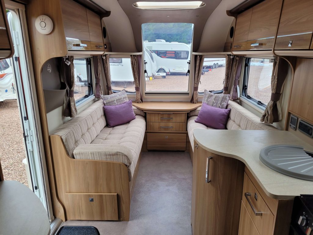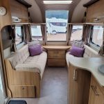 Very spacious eight-foot-wide, single axle four berth caravan featuring roomy G-Shaped seating at the front, which converts to a double bed. The bedroom area has a transverse fixed island bed, the centre kitchen area includes a full cooker, fridge and integrated microwave, whilst the end bathroom has a separate shower cubicle, vanity hand basin unit and electric flush swivel cassette toilet.
