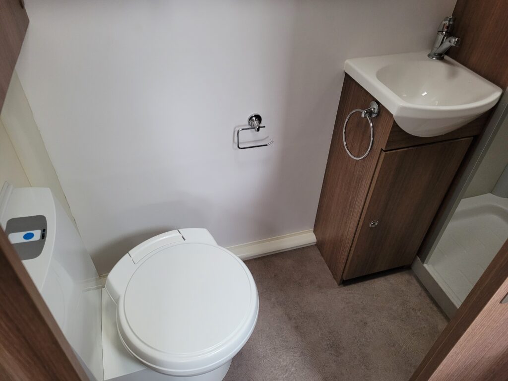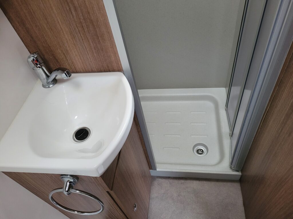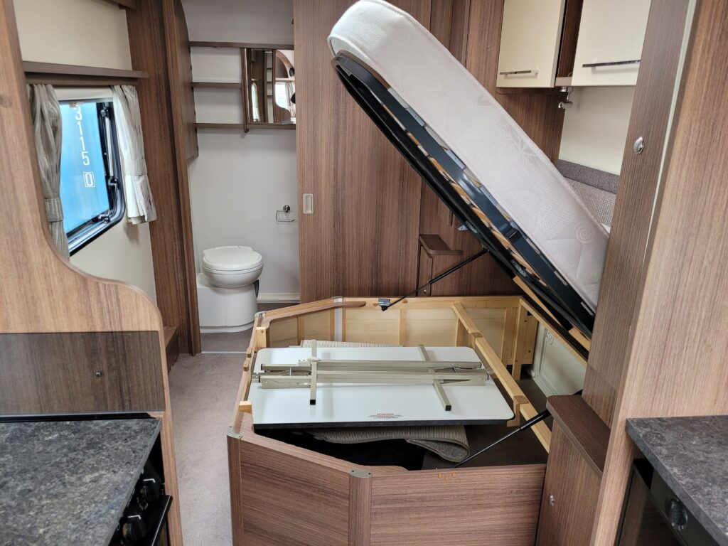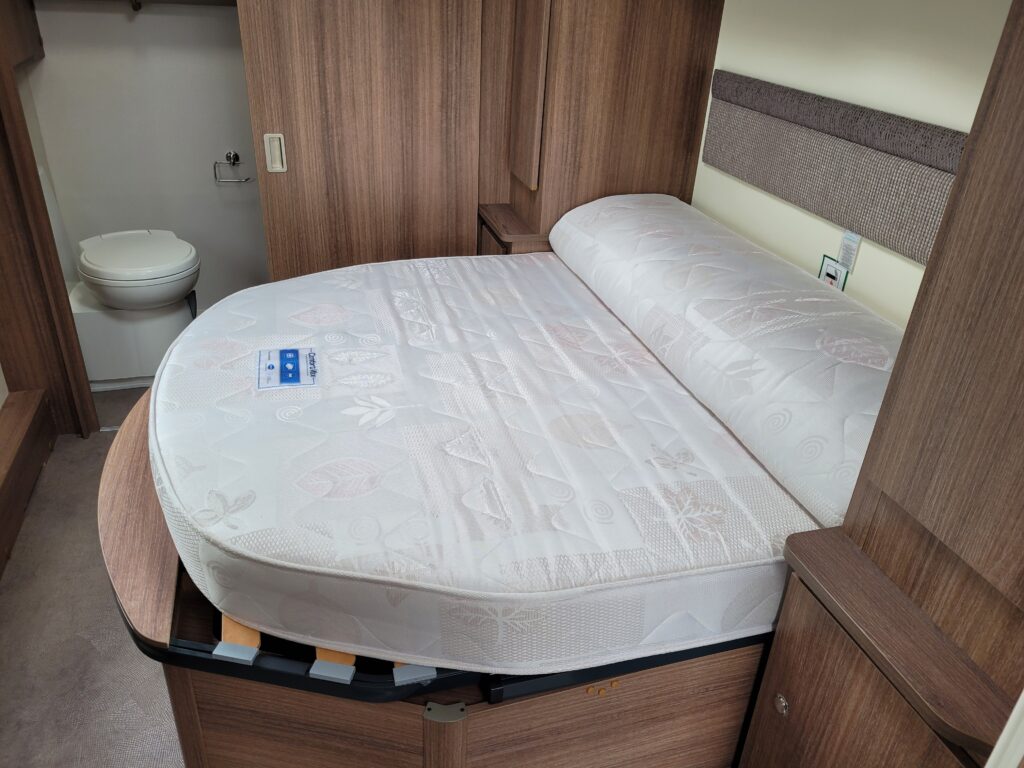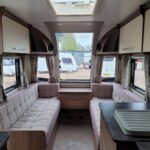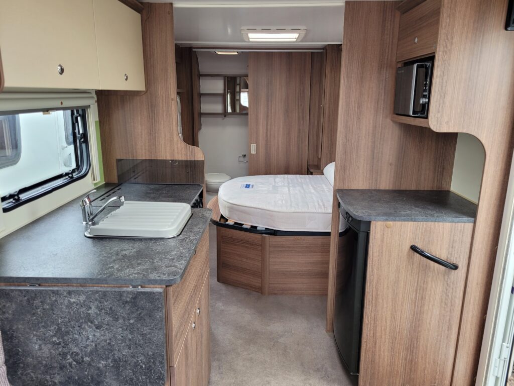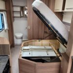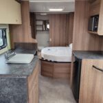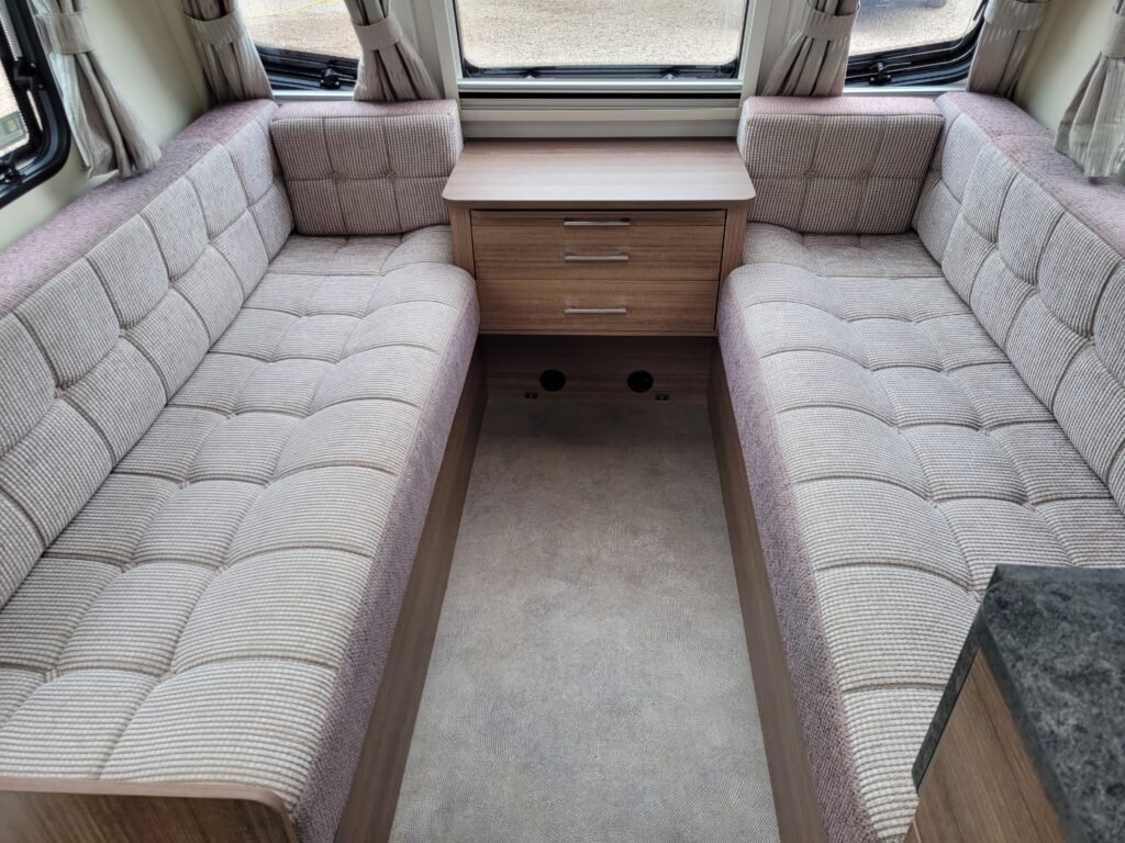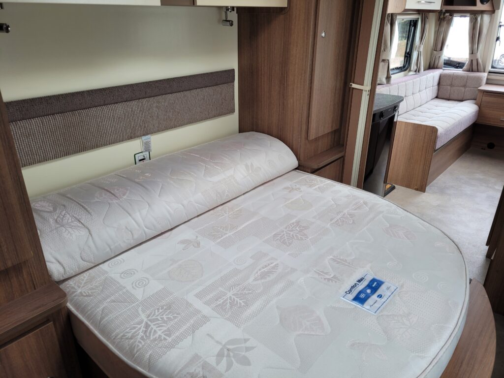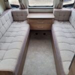 Spacious single axle four berth caravan with the popular transverse fixed island bed layout. Bench seating converting to an additional double bed at the front, centre kitchen area with fridge, full cooker and integrated microwave, whilst the end bathroom has a cassette toilet, separate shower cubicle and vanity hand basin unit. This caravan further benefits from a motor mover already fitted for ease of manoeuvring .