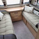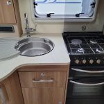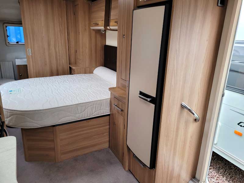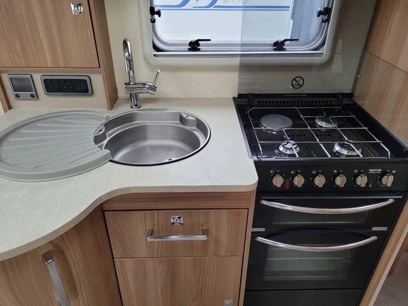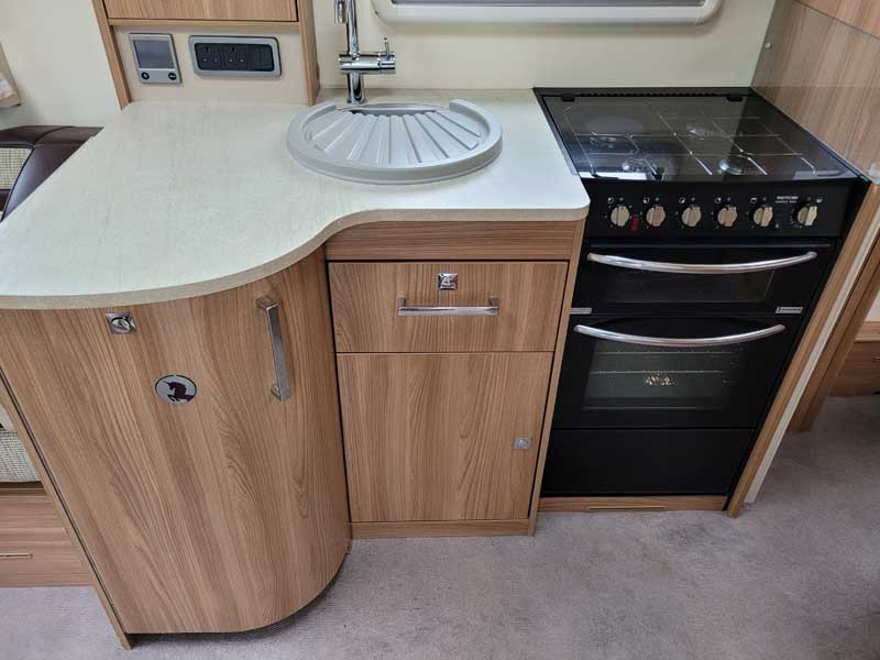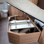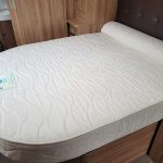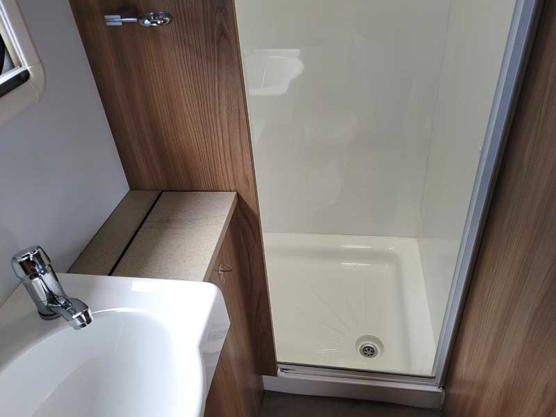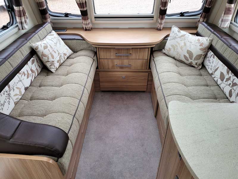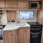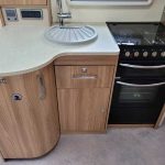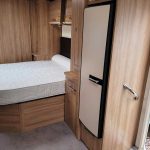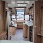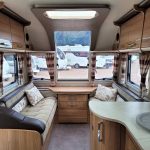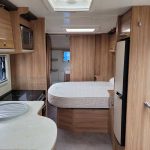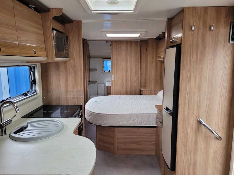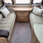 Spacious and bright four berth caravan, featuring the popular transverse fixed island bed. Bench seating at the front converts to another double bed, the centre kitchen area includes a full cooker, fridge and integrated microwave, whilst the end bathroom has a large separate shower cubicle, vanity hand basin unit and electric flush swivel cassette toilet.