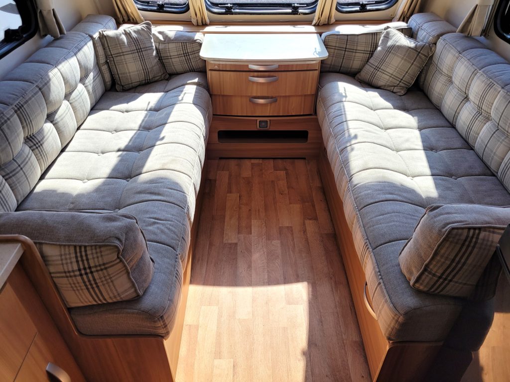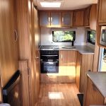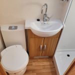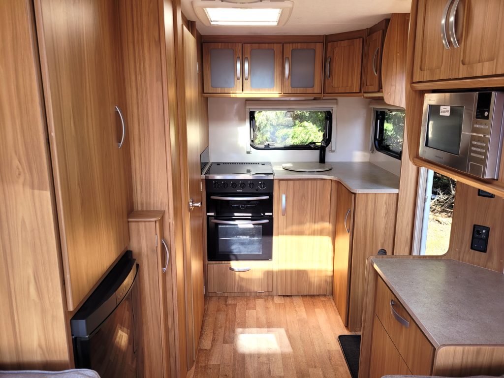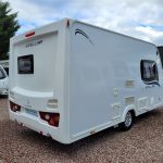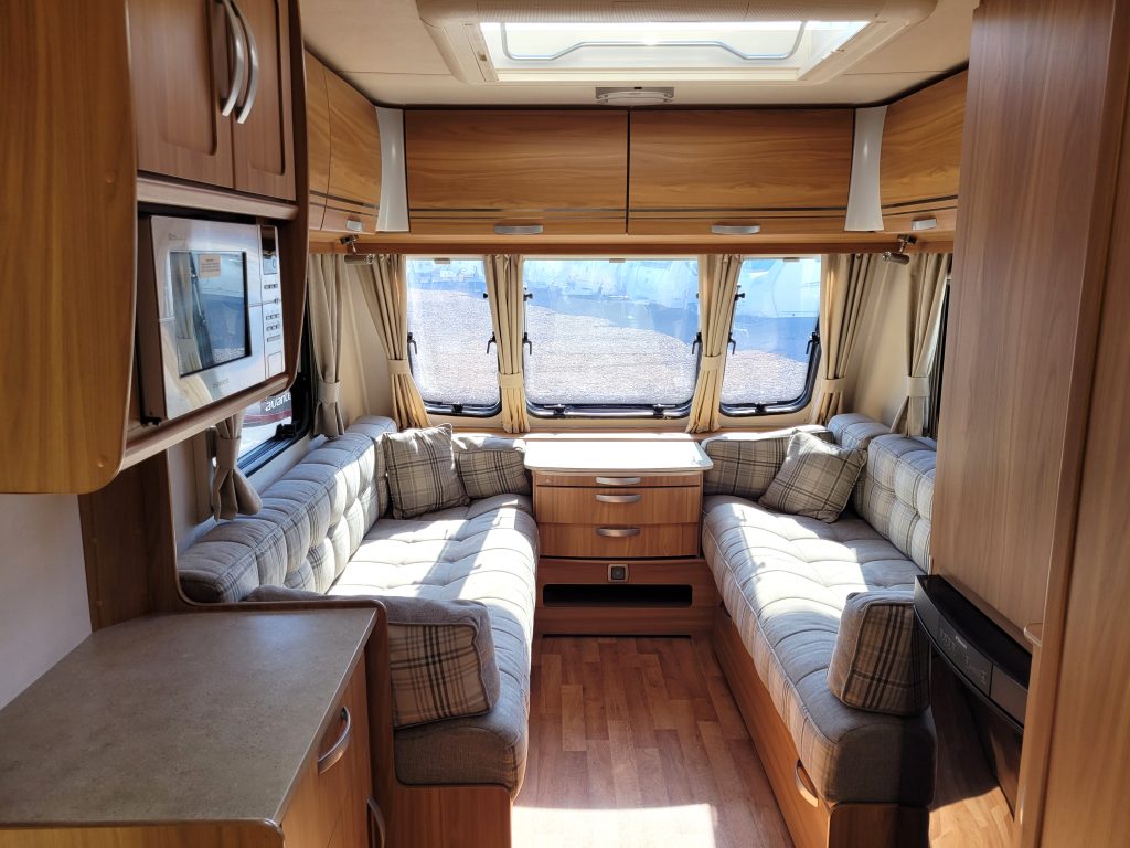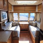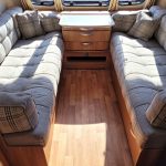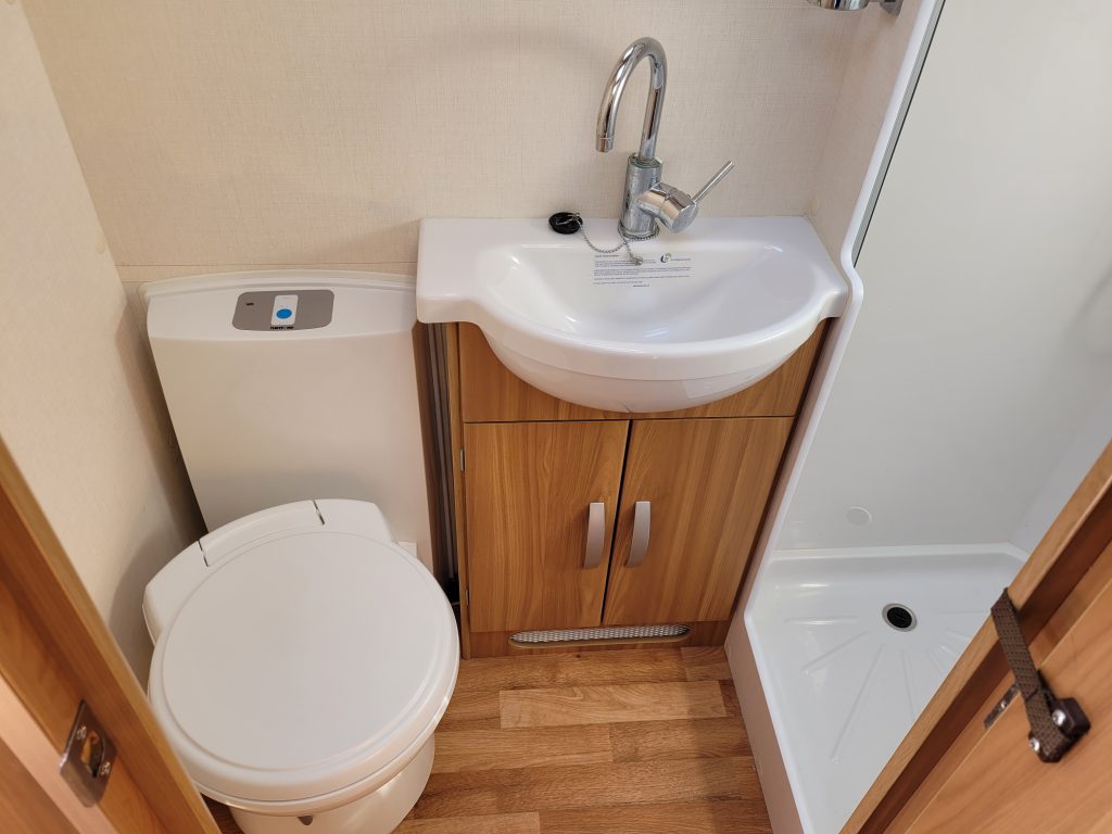 Compact and lightweight two berth caravan featuring long bench seating at the front converting to a large double bed, end kitchen with full cooker, microwave and fridge, whilst the side bathroom even has a large separate shower cubicle.