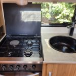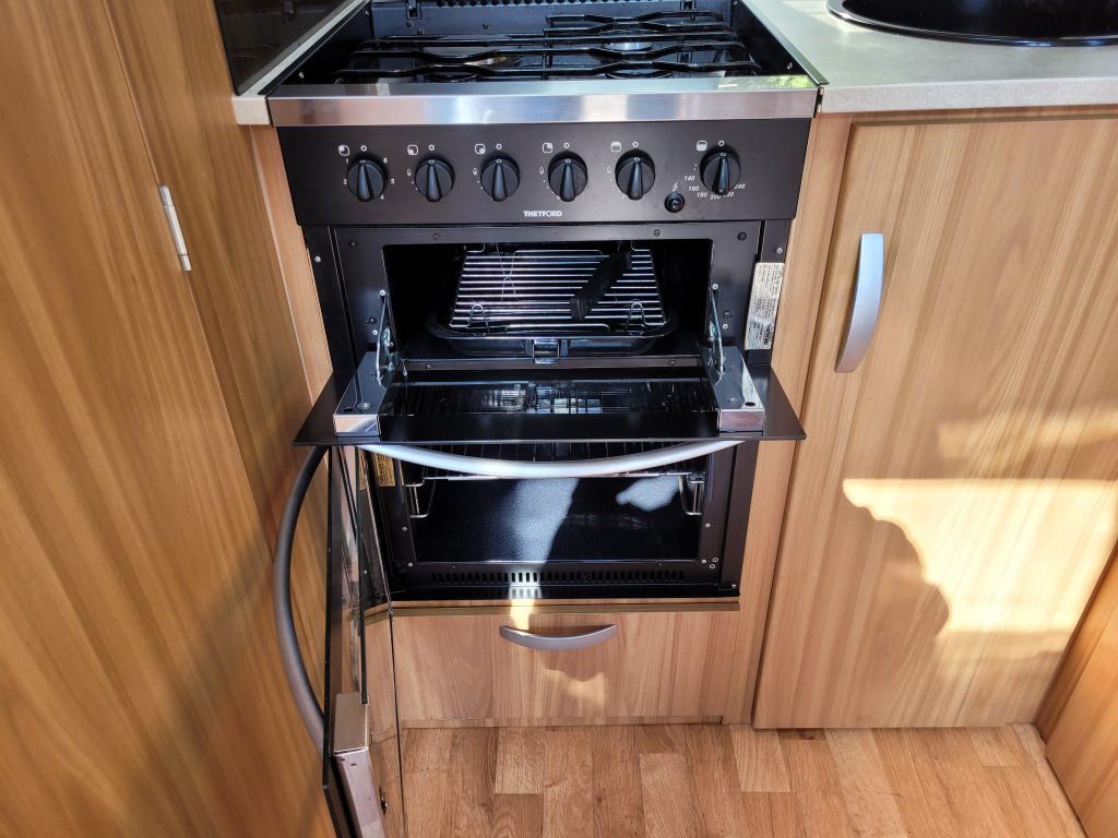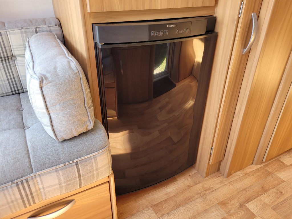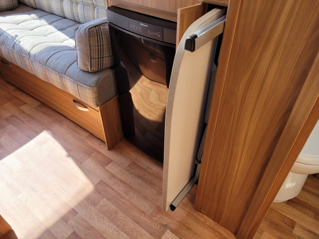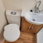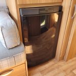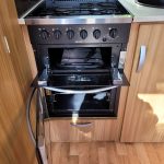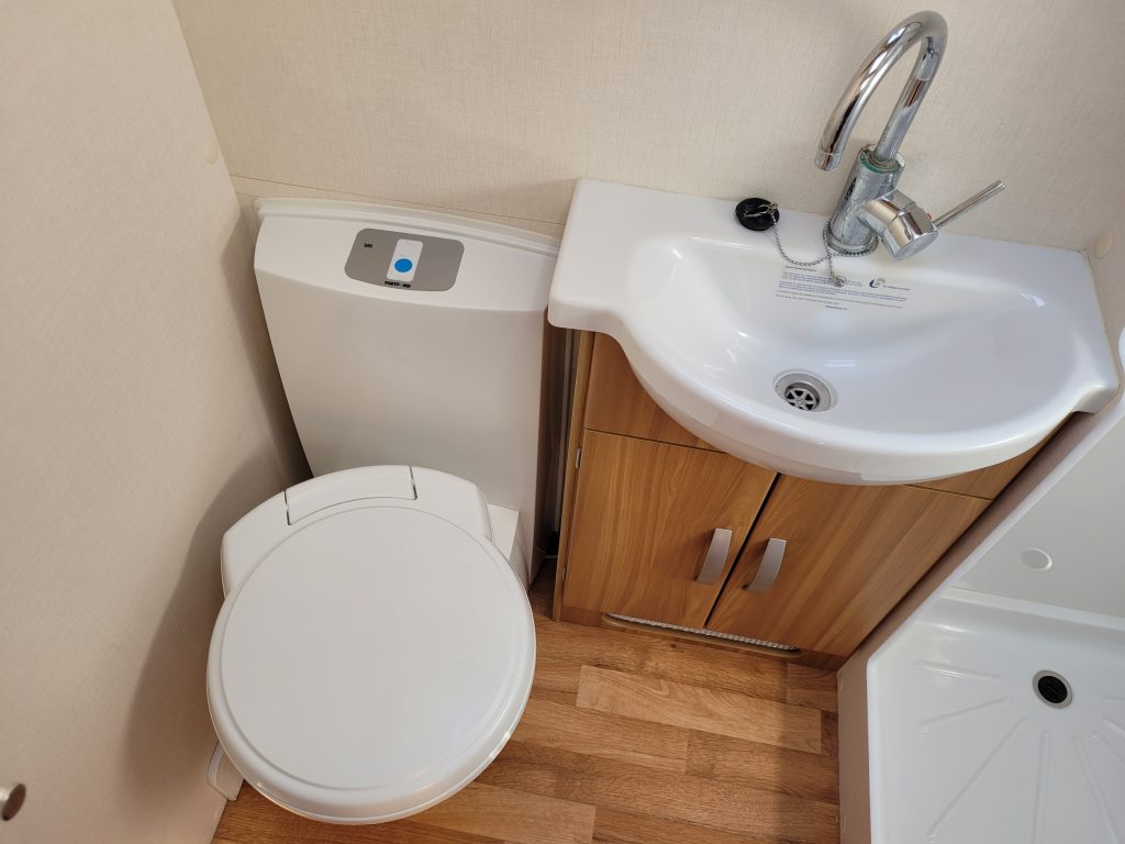 Compact and lightweight two berth caravan featuring long bench seating at the front converting to a large double bed, end kitchen with full cooker, microwave and fridge, whilst the side bathroom even has a large separate shower cubicle.